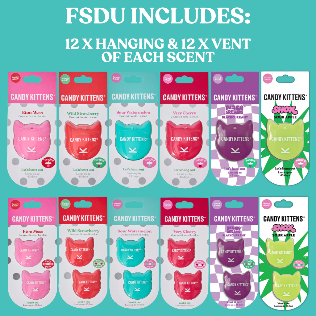 FSDU Includes 12 x Hanging 3D & 12 x Vent Air Fresheners in Fragrances: Sour Watermelon, Very Cherry, Wild Strawberry, Eton Mess, Disco Dreams Blackcurrant, Shox Sour Apple.