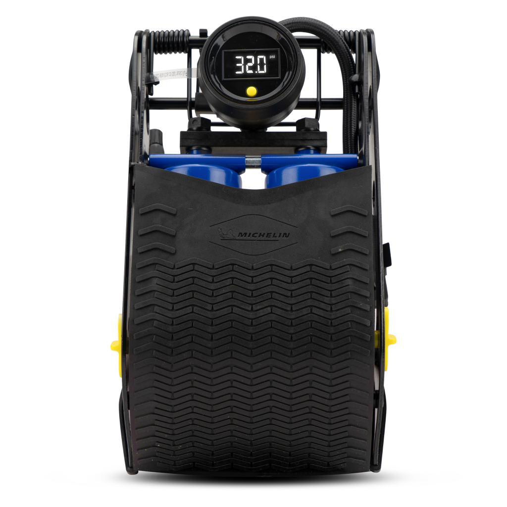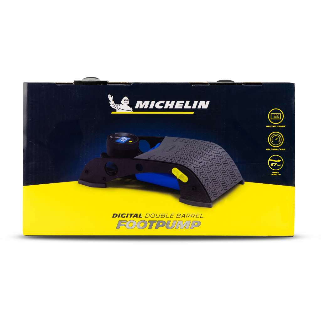 The MICHELIN Digital Double Barrel Foot Pump is the perfect choice for inflating various items such as vehicle and bicycle tyres, balls and airbeds. The durable wide stance steel frame and rubber feet ensure exceptional stability during use, while the ergonomic rubber treadplate enhances grip and pumping efficiency. The 67cm hose, along with the screw on tyre valve connector, facilitates easy and convenient inflation.